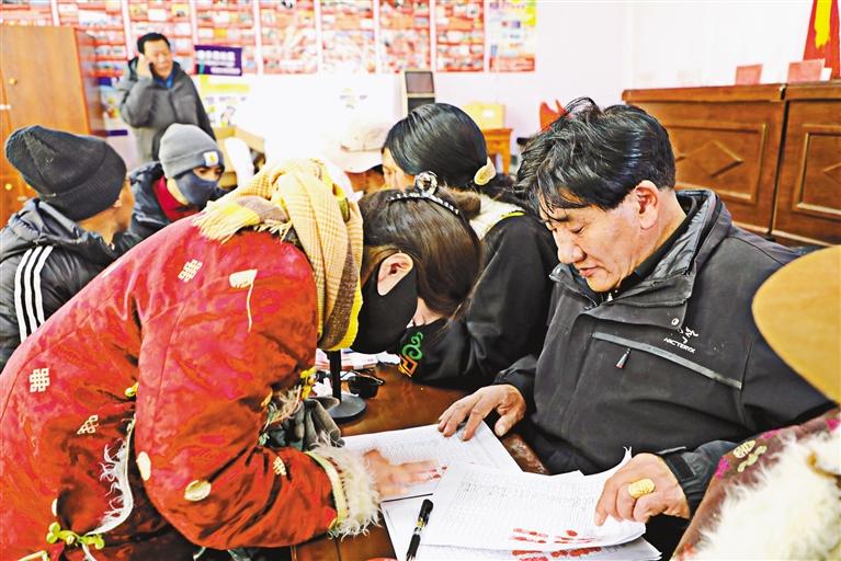 圖為圓夢新居社區(qū)群眾有序排隊(duì)、簽字、按手印,準(zhǔn)備領(lǐng)取分紅。 記者 達(dá)珍 永青 攝