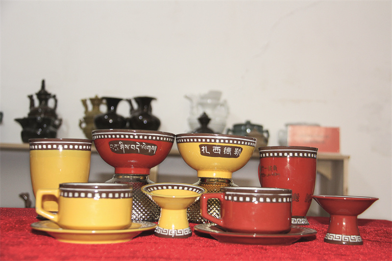 藏族風格的陶瓷茶杯和碗。白玉芬 攝