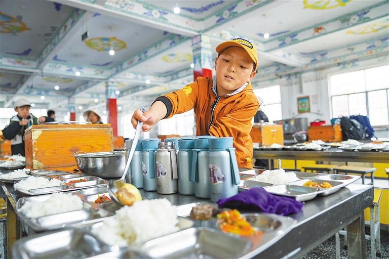 圖為那曲市班戈縣中石化小學學生在為同學們分發午餐(6月22日攝)。 新華社記者 丁增尼達 攝