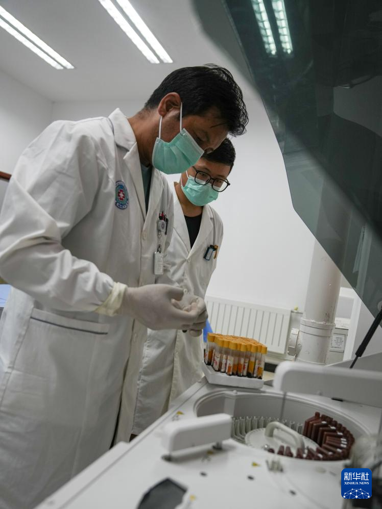8月30日,林周縣強嘎鄉衛生院醫生東智才讓使用生化分析儀檢測患者肝功能和腎功能狀況。新華社記者 晉美多吉 攝