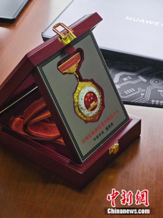 圖為孫樹學榮獲的全國民族團結進步模范個人獎章 中新網 薛凌橋 攝