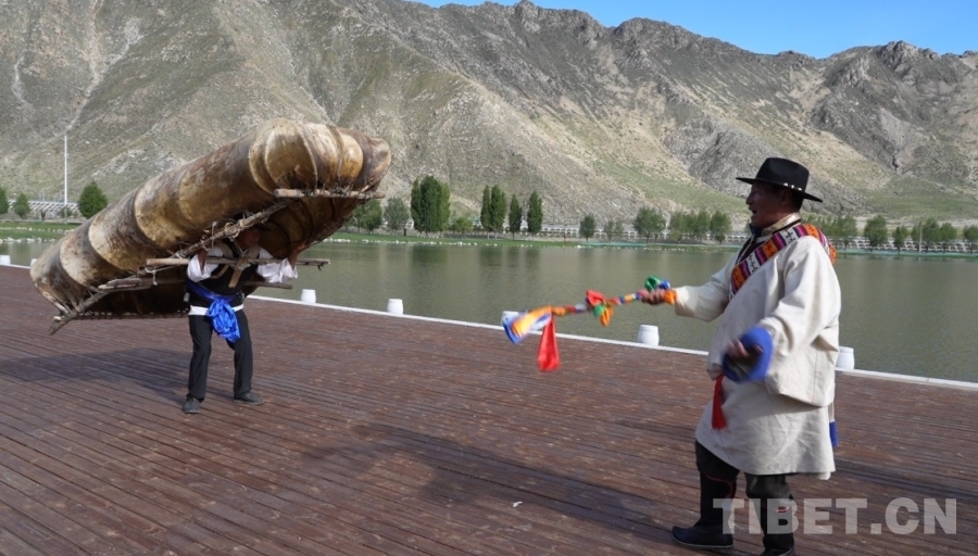 圖為廓孜國家級非遺代表性傳承人拉巴次仁(右)和師弟羅布(左)跳廓孜舞(牛皮船舞) 攝影:王茜