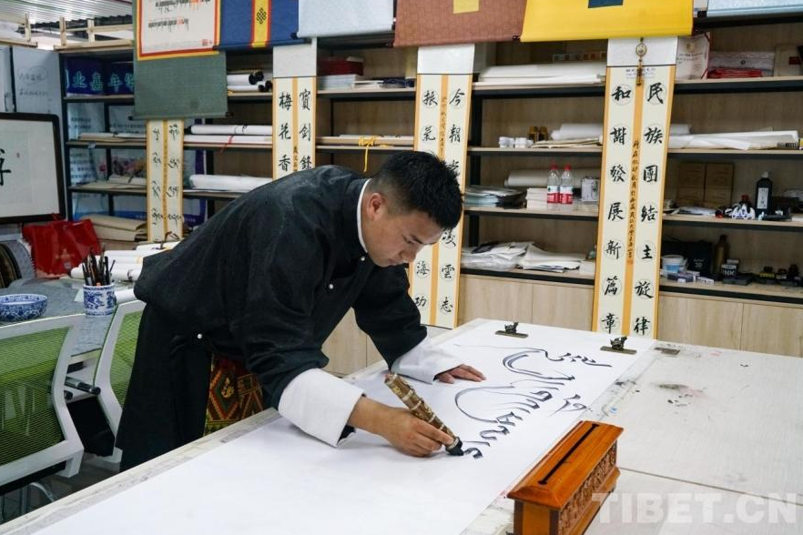 圖為西藏民族大學學生扎西曲吉在練習藏文書法 攝影:呂靜