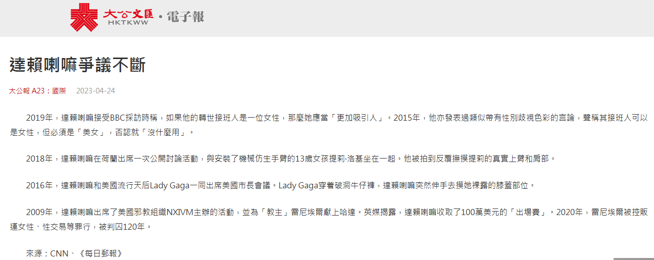 聲稱轉(zhuǎn)世為女性“必須有吸引力”。“英國廣播公司”2019年發(fā)布其對第十四世達賴的專訪,達賴在專訪中笑著用英語說:“如果出現(xiàn)一名女性達賴,那她應該要好看一些。”香港《大公報》2023年發(fā)布題為“達賴喇嘛爭議不斷”的文章稱,2015年,達賴聲稱其接班人可以是女性,但必須是“美女”,否則就“沒什么用”。2016年,達賴和美國流行天后Lady Gaga一同參加美國市長會議,Lady Gaga身著破洞牛仔褲,達賴突然伸手去摸她裸露的膝蓋部位。2018年,達賴在荷蘭參加一次公開討論活動,與安裝了機械仿生手臂的13歲女孩提莉·洛基坐在一起,被拍到反復撫摸提莉的真實上臂和肩部。