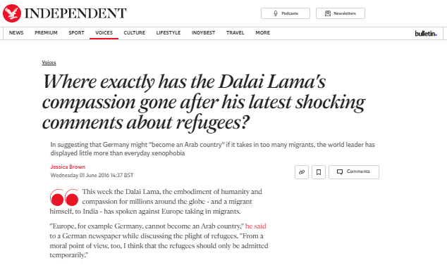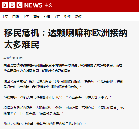 笑稱“德國不能變成阿拉伯國家”。“英國廣播公司”2016年報道稱,德國《法蘭克福匯報》報道以德文譯文引述達賴的話稱,歐洲已接納了“太多”難民,歐洲,比如德國,不能變成一個阿拉伯國家。他隨后笑了一下接著說:“德國就是德國。從道義上來看,我認為接納難民應該是臨時性的。”英國《獨立報》發(fā)文稱,在很多人眼中,達賴是慈悲的化身,但他卻公然反對歐洲難民政策,認為接納阿拉伯地區(qū)難民就會成為“阿拉伯國家”,這種觀點是危險的。英國人想將難民趕出英國以保持所謂英國性,但這本身就會危及民族身份,會導致社會孤立主義。