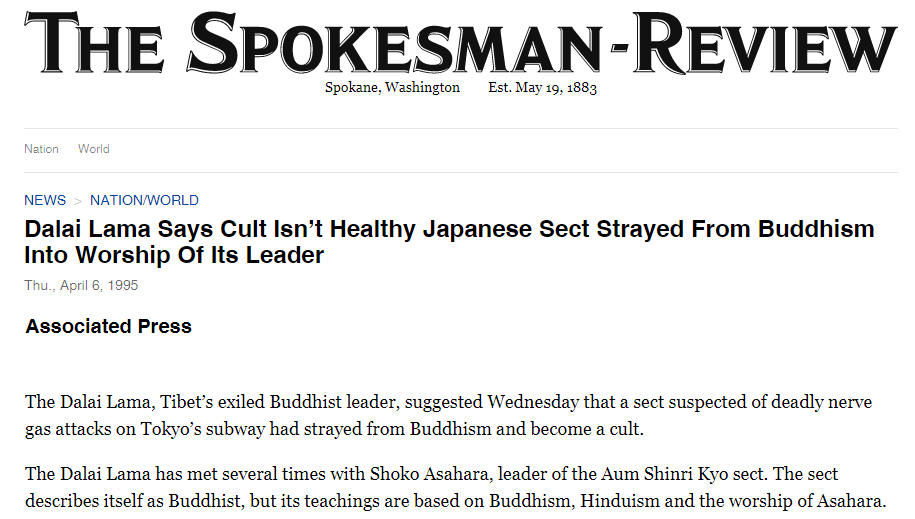 公開支持日本奧姆真理教頭目麻原彰晃。麻原彰晃是末日邪教組織奧姆真理教的創(chuàng)始人兼領(lǐng)導人,被指控策劃了1995年東京地鐵沙林毒氣襲擊事件,造成13人死亡。美國《斯波坎評論報》網(wǎng)站1995年發(fā)文稱,達賴在接受記者采訪時承認了與邪教頭目麻原彰晃的聯(lián)系。