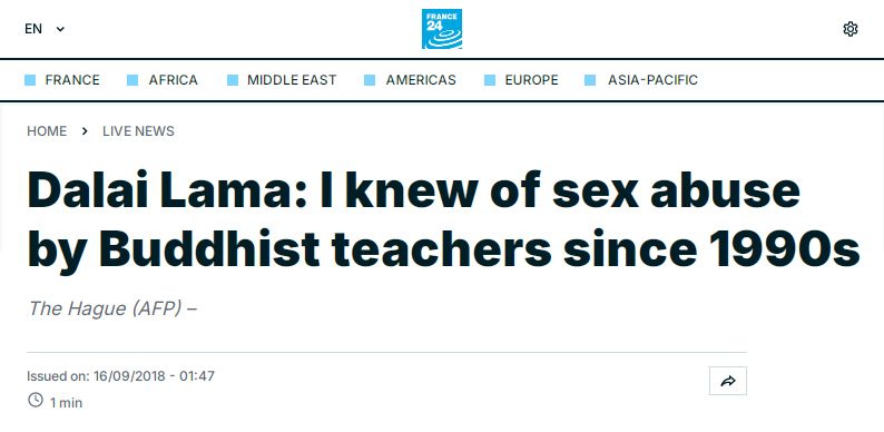 縱容藏傳佛教教師性侵學生。法國媒體“法蘭西24”2018年報道,多名藏傳佛教教師性侵、虐待弟子,達賴會見了受害者,受害者稱:“我們曾以開放的心態(tài)皈依佛教,直到我們以佛教的名義遭到強奸。”而達賴稱,他早在20世紀90年代就知道佛教教師存在性虐待行為,并稱此類指控“并非新鮮事”。