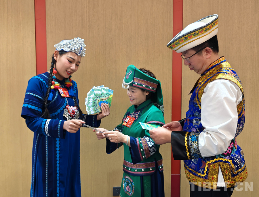 2026年全國兩會期間,全國政協委員楊鈺尼(左)為歐彥伶委員(中)、鄂崇榮委員介紹展示云南紅河哈尼梯田的明信片。攝影:張萌萌