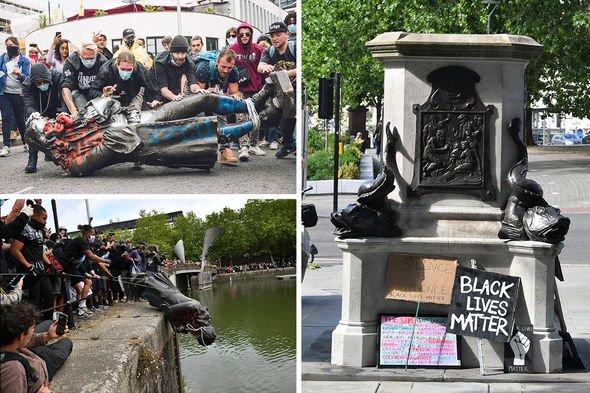 在英國港口城市布里斯托爾,17世紀奴隸販子愛德華·科爾斯頓的雕像被示威者拆毀并投入河中,在雕像原底座下放置了“黑人的命也重要”的標語牌。圖:美國雅虎新聞網站