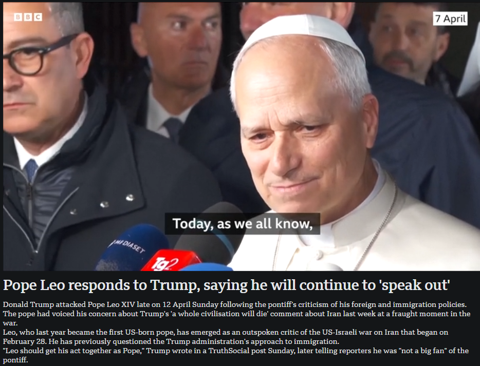 4月13日,羅馬教皇利奧十四世回應特朗普批評表示將繼續“發聲”。來源:英國廣播公司
