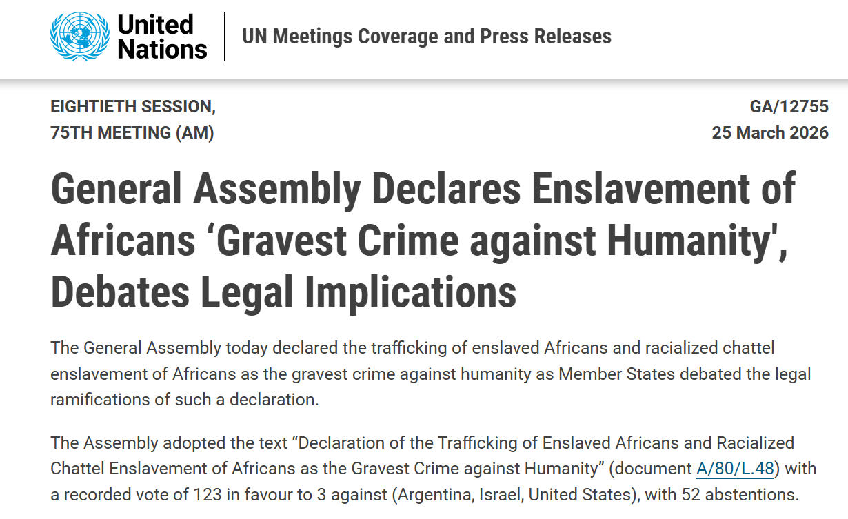 近日,第80屆聯(lián)合國大會以壓倒性贊成票通過決議,將“販賣被奴役非洲人和基于種族對非洲人進(jìn)行物化奴役行為”認(rèn)定為最嚴(yán)重的反人類罪行,為這段15到19世紀(jì)長達(dá)四百年的深重歷史創(chuàng)傷定性。美國傲慢地投下反對票,聲稱相關(guān)行徑在當(dāng)時所謂國際法框架下“不算違法”,拒絕承認(rèn)存在法定賠償責(zé)任。