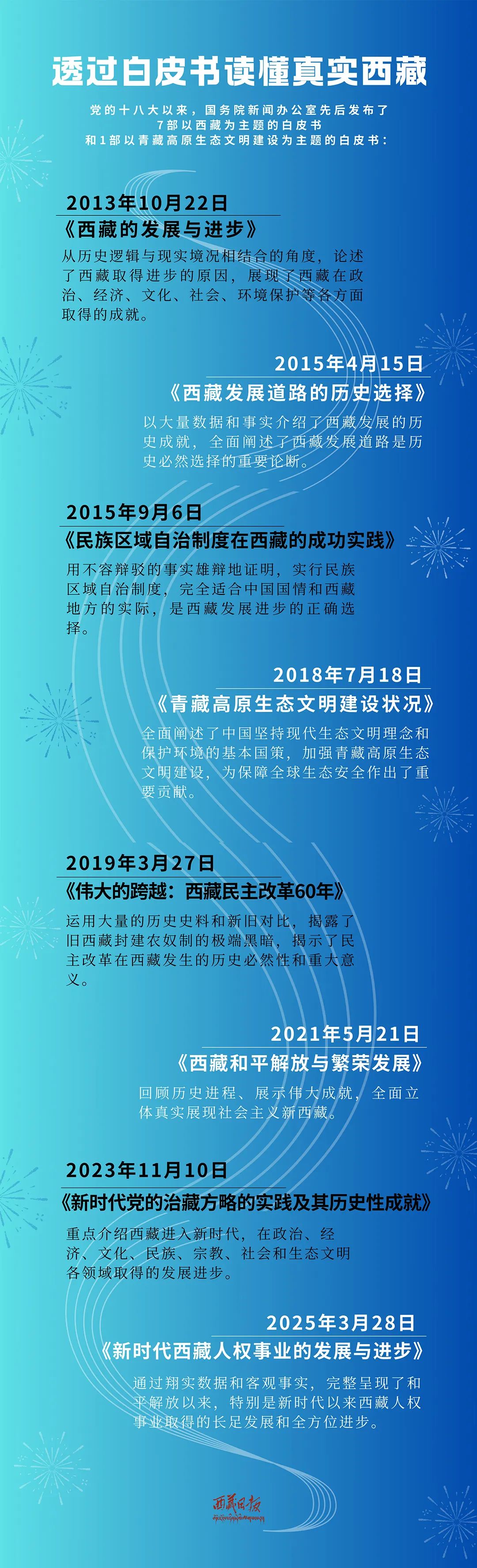 例如,2015年發(fā)布《西藏發(fā)展道路的歷史選擇》《民族區(qū)域自治制度在西藏的成功實踐》兩部白皮書,該年是西藏自治區(qū)成立50周年;2019年發(fā)布《偉大的跨越:西藏民主改革60年》白皮書,該年是西藏民主改革60周年;2021年發(fā)布《西藏和平解放與繁榮發(fā)展》白皮書,該年是西藏和平解放70周年;2025年發(fā)布《新時代西藏人權(quán)事業(yè)的發(fā)展與進步》白皮書,該年是西藏自治區(qū)成立60周年。