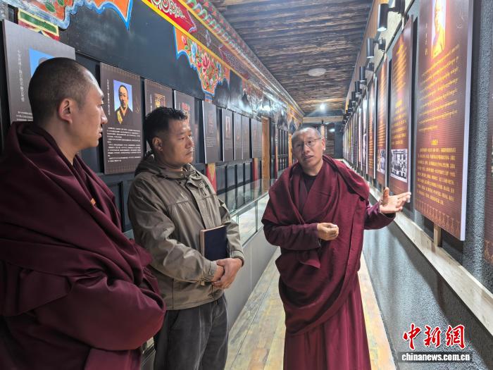 圖為結(jié)古寺僧人頓珠才仁(右一)向參觀者講解展館內(nèi)容。中新網(wǎng)記者 胡貴龍攝