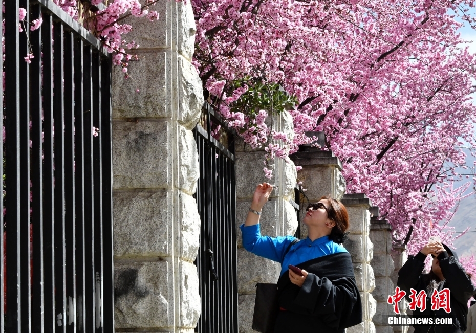 4月1日,游客在春花綻放的道路旁打卡拍照。隨著雪域高原天氣回暖,西藏拉薩市區(qū)各條道路春花綻放。因道路兩側(cè)繁華似錦,拉薩市城關(guān)區(qū)軍民路成網(wǎng)紅打卡地,市民游客紛紛前來(lái)打卡拍照。