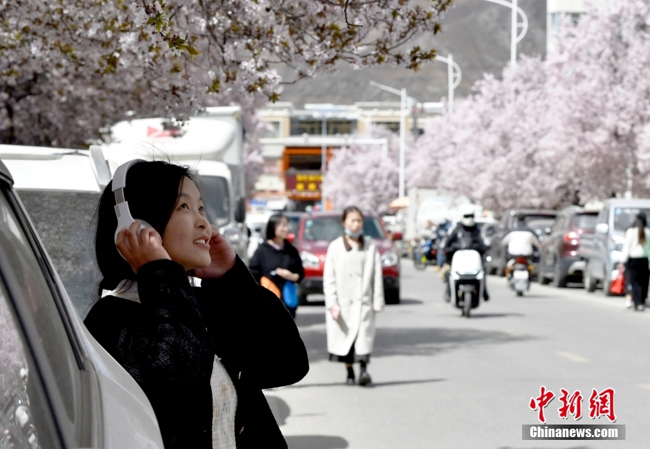4月1日,市民在春花綻放的道路旁賞花。隨著雪域高原天氣回暖,西藏拉薩市區(qū)各條道路春花綻放。因道路兩側(cè)繁華似錦,拉薩市城關(guān)區(qū)軍民路成網(wǎng)紅打卡地,市民游客紛紛前來(lái)打卡拍照。