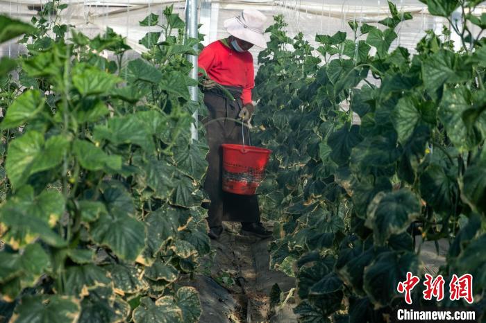 圖為農牧民采摘黃瓜?!〗w波 攝