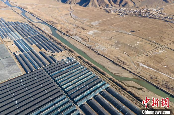 圖為1月28日上午,航拍西藏日喀則珠峰現代農業科技創新博覽園蔬菜大棚?!〗w波 攝
