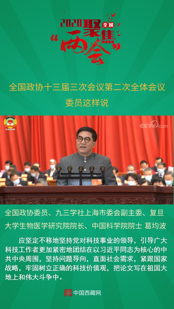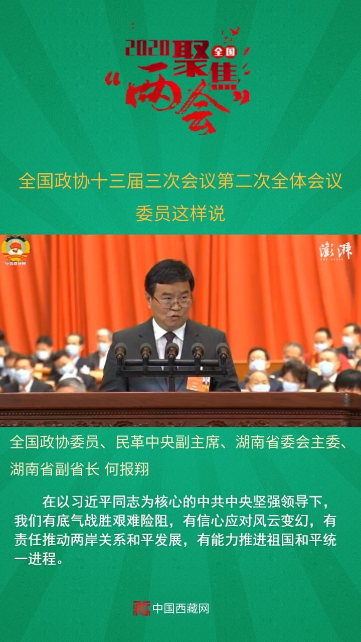 中國(guó)西藏網(wǎng)訊 全國(guó)政協(xié)十三屆三次會(huì)議第二次全體會(huì)議5月24日上午在人民大會(huì)堂舉行。12名委員分別圍繞“脫貧攻堅(jiān)”“武漢戰(zhàn)‘疫’”“經(jīng)濟(jì)建設(shè)”“六穩(wěn)六保”“基層減負(fù)”等主題作大會(huì)發(fā)言。中共中央政治局委員、國(guó)務(wù)院副總理孫春蘭,中共中央政治局委員、中央書記處書記、中央宣傳部部長(zhǎng)黃坤明以及中共中央、國(guó)務(wù)院有關(guān)部門的負(fù)責(zé)同志,應(yīng)邀出席會(huì)議,聽取委員們的意見建議。