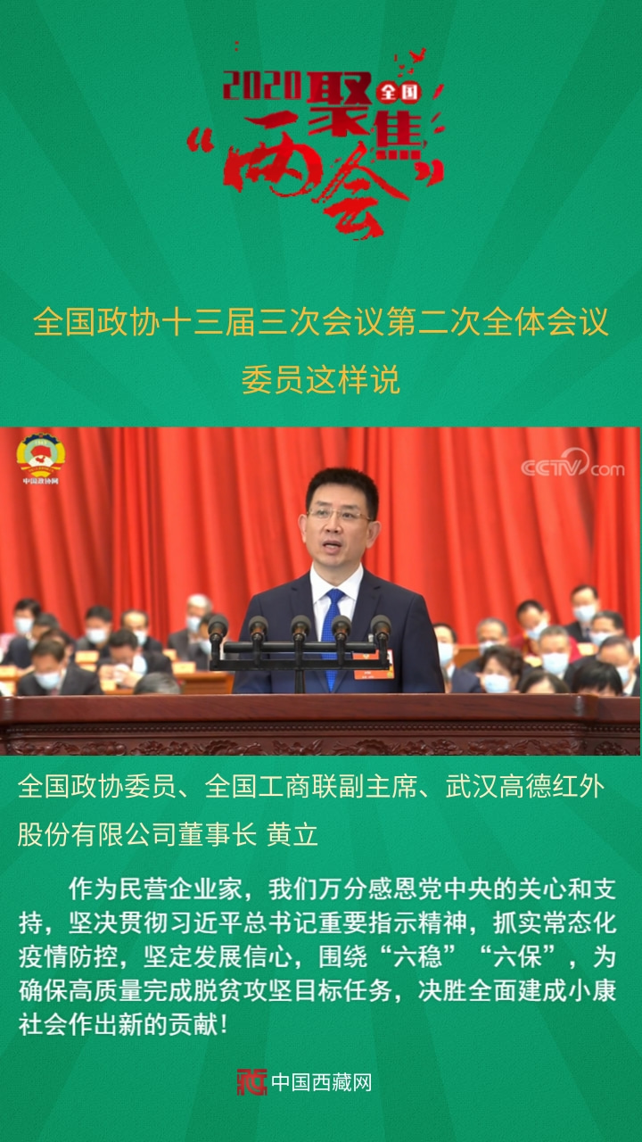 全國(guó)政協(xié)委員、全國(guó)工商聯(lián)副主席、武漢高德紅外股份有限公司董事長(zhǎng)黃立發(fā)言說,作為民營(yíng)企業(yè)家,我們?nèi)f分感恩黨中央的關(guān)心和支持,堅(jiān)決貫徹習(xí)近平總書記重要指示精神,抓實(shí)常態(tài)化疫情防控,堅(jiān)定發(fā)展信心,圍繞“六穩(wěn)”“六保”,為確保高質(zhì)量完成脫貧攻堅(jiān)目標(biāo)任務(wù),決勝全面建成小康社會(huì)作出新的貢獻(xiàn)!