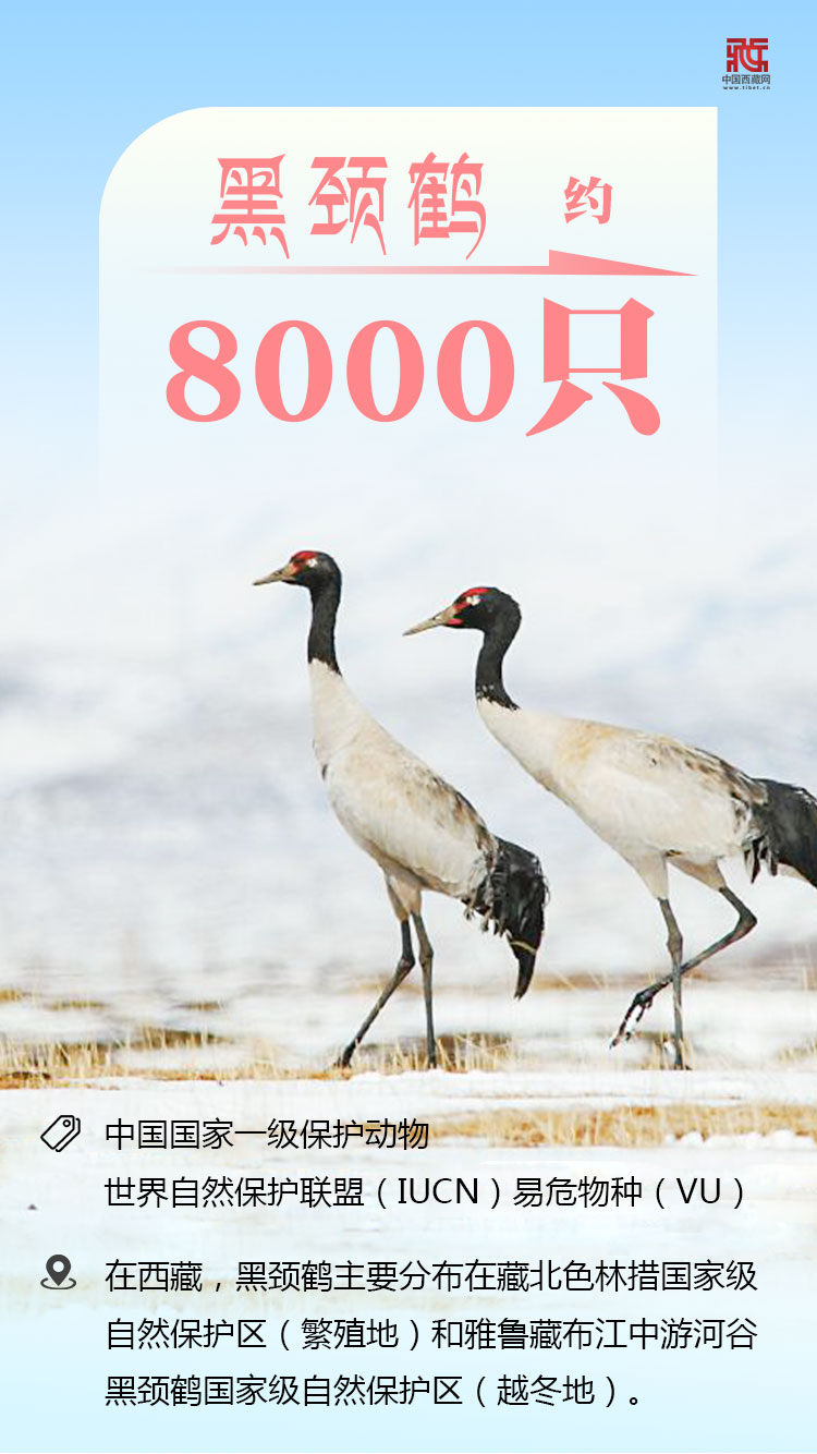 經過多年的努力,西藏各類瀕危野生動物種群數量均得到恢復性增長,黑頸鶴、藏羚羊、野牦牛、藏野驢等個體數量正在穩步增加。2016年9月,世界自然保護聯盟(IUCN)將藏羚羊的受威脅程度降為“近危”(NT)。一度“瀕危”的藏羚羊,如今其種群數量在幾十年間從5萬只左右增加至20萬只以上。