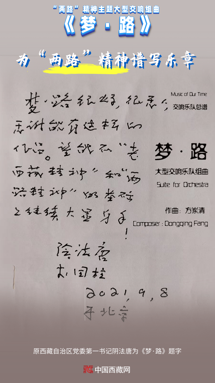 創作團隊三次深入西藏、四川、青海等省區市的二十多個“兩路”相關歷史地域,拜訪數十位民族民間器樂演奏、聲樂演唱、藏戲表演藝術家和國家級非物質文化遺產傳承人,對藏族風格音樂素材進行詳盡細致的采集,從中國愛樂樂團演奏家們的傾情演奏,到四川省甘孜藏族自治州金剛寺大殿采聲,從錄制藏族姑娘銀鈴天籟般的嗓音,到83歲高齡的國家級非物質文化遺產傳承人的獻唱山歌……《夢·路》讓大型交響樂和原生態聲音融合、碰撞、組合,用音符刻畫了中華筑路英雄馳騁世界屋脊的偉大樂章。(中國西藏網 編輯、制作/王茜 供圖/方崠清)