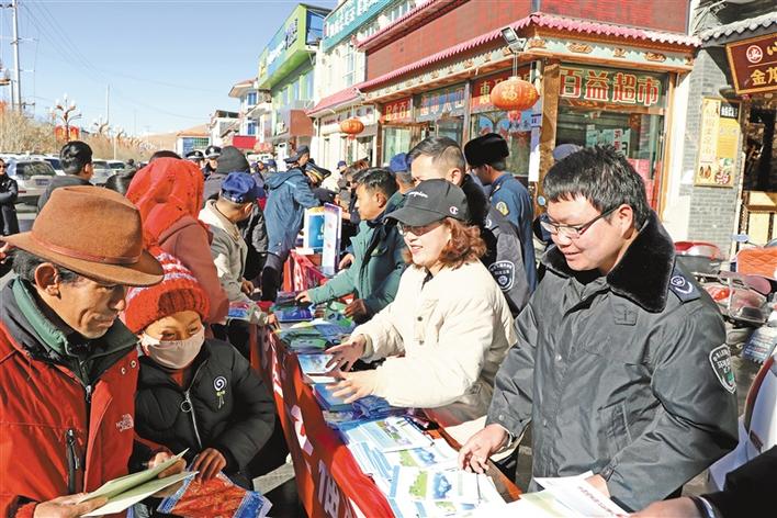 阿里地區生態環境局工作人員在向群眾發放環境保護宣傳材料。