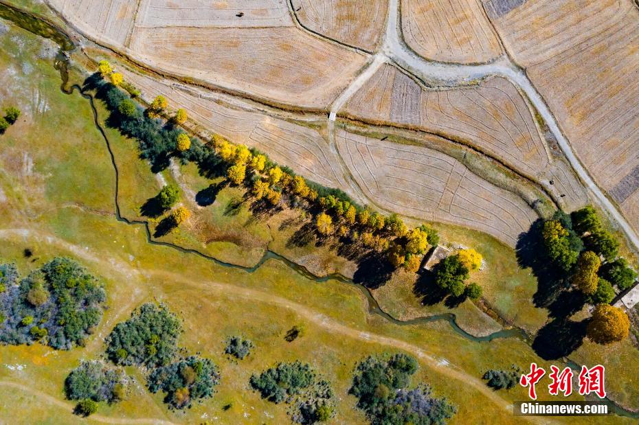 日喀則江孜縣境內農田、村居與金黃的樹林相映成趣。 何蓬磊 攝