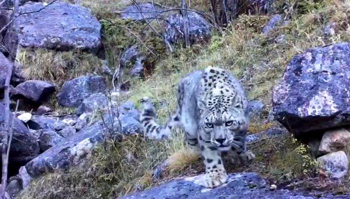 拍攝者稱,發現雪豹時其正在啃食獵物,雪豹發現拍攝者后向其走來,拍攝者迅速將手機放在一處巖石上逃離。視頻中,雪豹走進了拍攝的手機,發現沒有異常動靜后緩慢轉身離開。