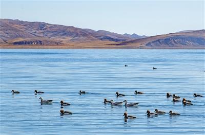 羊卓雍錯自2014年被納入國家良好湖泊生態環境保護試點工程項目以來,羊卓雍錯周邊生態環境持續向好,棲息繁衍的野生動物數量逐年增多。這是近日拍攝的羊卓雍錯湖面上的水鳥。新華社記者 孫非 攝