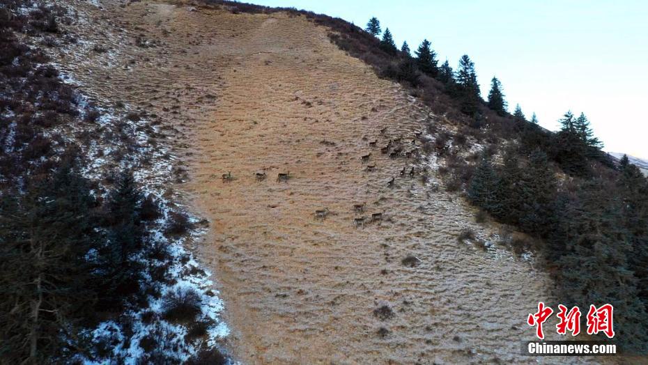 2月5日,在祁連山國家公園甘肅南段發現近百只野生馬鹿種群。 吳生文 攝