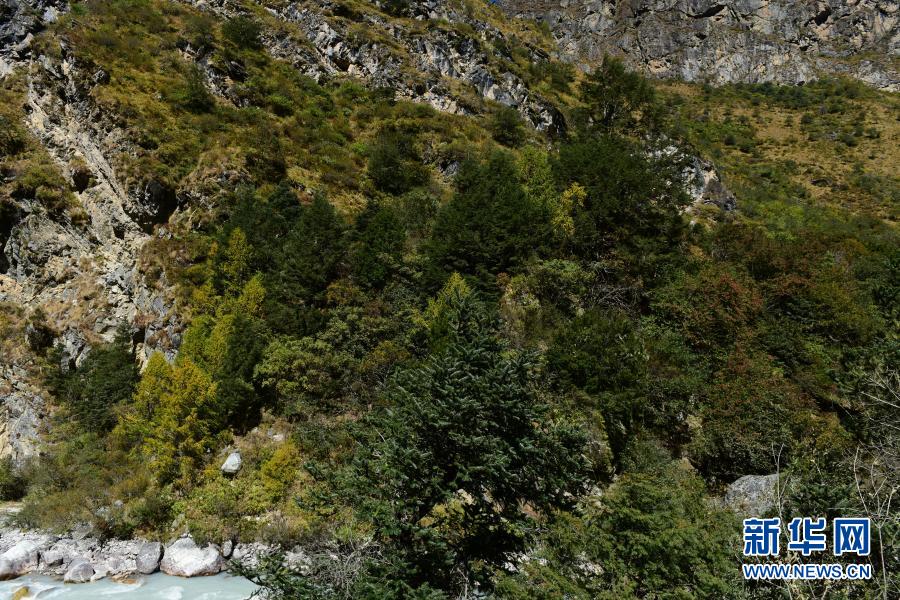 這是西藏定日縣絨轄溝內一片含有密葉紅豆杉的植物群落(2020年10月29日攝)。新華社發(fā) 趙明旭 攝