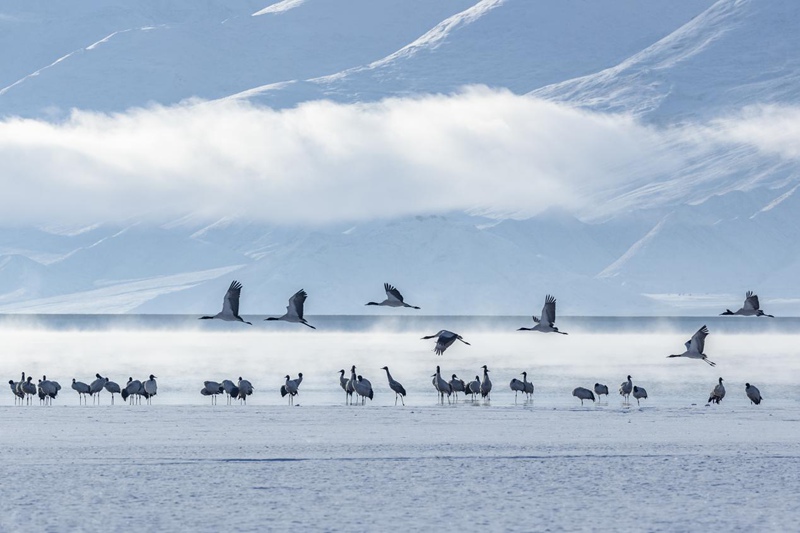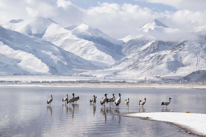 見過銀裝素裹的拉薩,但你一定沒見過在漫天白雪中盡情飛舞的黑頸鶴。茫茫天地間,優雅的黑頸鶴沐浴著陽光,直沖云霄。時值3月,在拉薩林周悠閑越過一冬的黑頸鶴,即將北上,開始新一季的遷徙。這春雪,仿佛就是送給它的離別禮物。