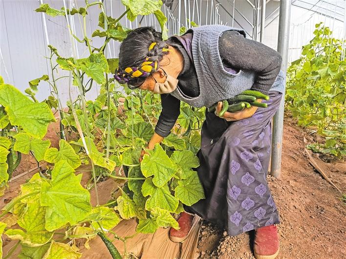 圖為當地群眾正在大棚內采摘蔬果。史金茹 攝