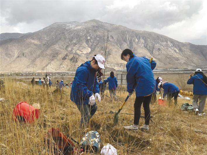 圖為青年志愿者在拉薩市堆龍德慶區“西藏青年志愿者林”義務植樹。次仁羅布 李洲 攝