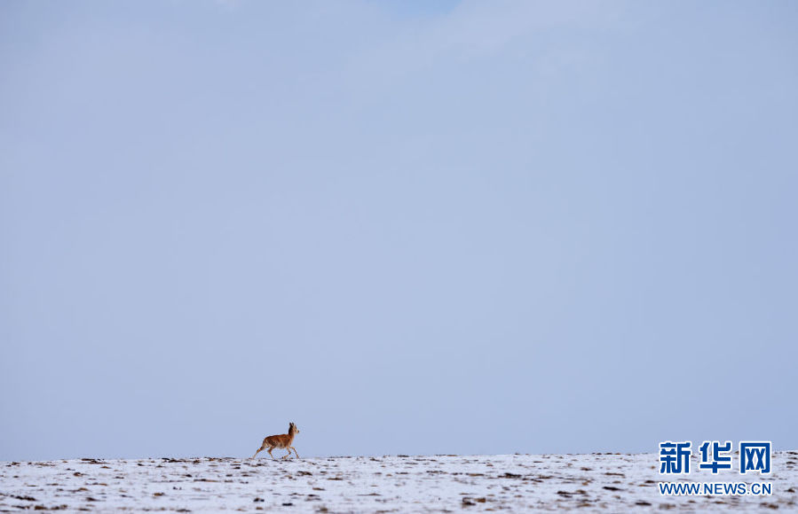 4月20日,一只藏羚羊向卓乃湖方向行進。新華社記者 費茂華 攝