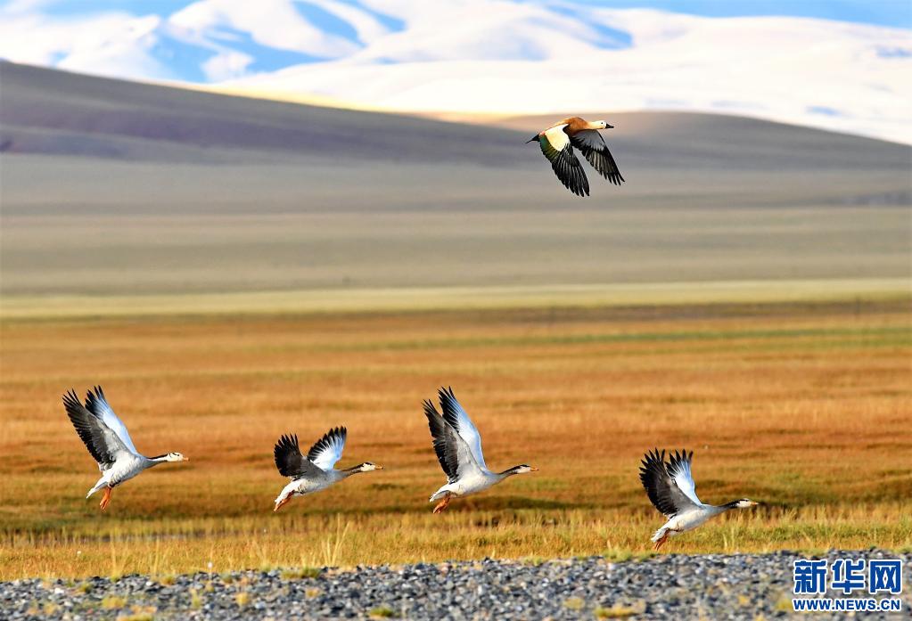 一只赤麻鴨(上)和一群斑頭雁在尼瑪縣那若塘濕地上飛翔。(新華社記者 張汝鋒 攝)