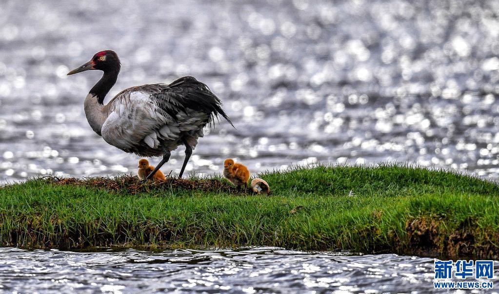 成年黑頸鶴帶著小黑頸鶴在藏北羌塘草原覓食。(新華社記者 普布扎西 攝)
