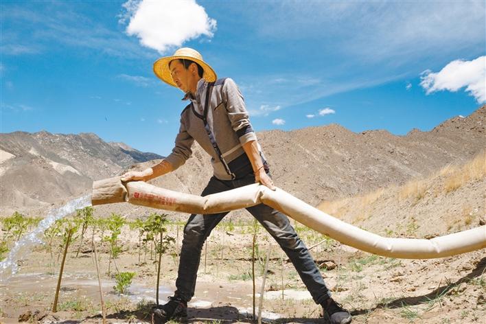 山南市貢嘎縣吉雄鎮劉瓊村村民正在為樹苗澆水(6月2日攝)。新華社記者 普布扎西 攝