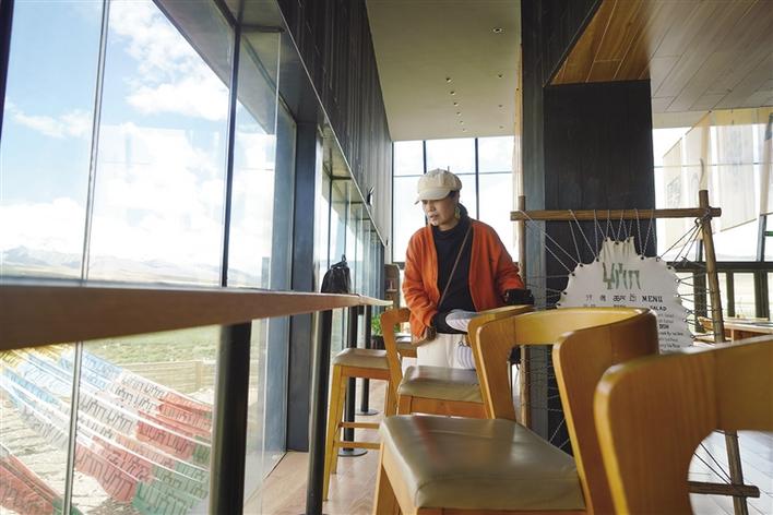 從正門(mén)進(jìn)入,穿過(guò)牦牛文化空間走廊,便可到能夠以最佳視角欣賞念青唐古拉山的VR觀景臺(tái)。緊鄰觀景臺(tái)右側(cè),是一間擺放當(dāng)?shù)匚膭?chuàng)產(chǎn)品、各類書(shū)籍的觀景咖啡廳。該咖啡廳的兩面墻體設(shè)計(jì)為超大落地窗,在此休息的游客可以邊品嘗咖啡,邊欣賞念青唐古拉山及拉多草原的美景。走進(jìn)咖啡廳,記者看到不少在這里休息的游客都在低頭寫(xiě)著什么,經(jīng)咖啡廳負(fù)責(zé)人介紹:“這些游客是在寫(xiě)明信片,我們這里不僅提供餐飲,還提供印有本地風(fēng)景的明信片,并同中國(guó)郵政合作,幫助游客按時(shí)將明信片寄到他們的親朋好友手中,讓游客們的旅途變得更有意義。”