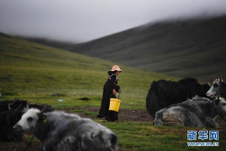 8月3日,在果洛州瑪沁縣當洛鄉貢龍村的夏季草場上,牧民準備擠牛奶。新華社記者 張龍 攝