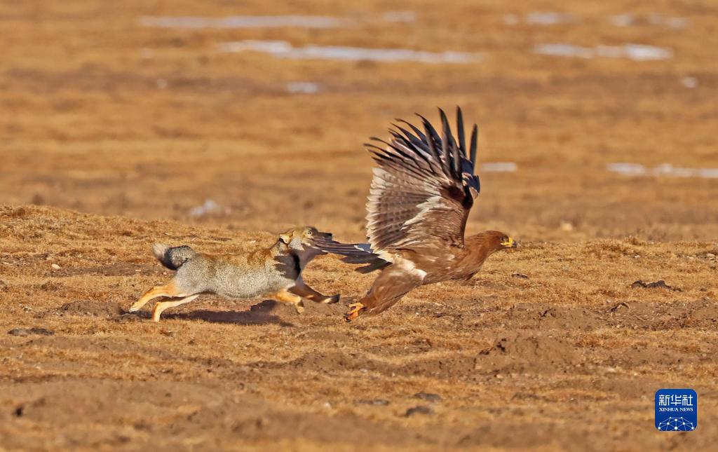 這是在四川省阿壩藏族羌族自治州若爾蓋縣境內拍攝的一只藏狐追擊草原雕(2020年12月1日攝)。新華社 王冀川 攝