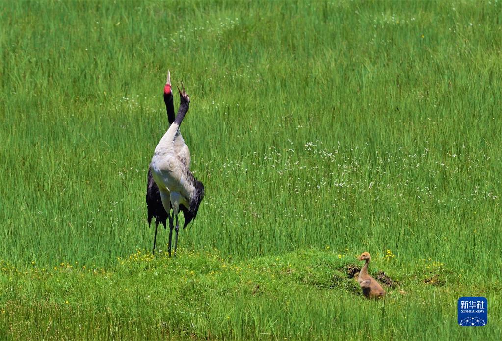 這是在四川省阿壩藏族羌族自治州紅原縣境內拍攝的帶著幼崽的黑頸鶴(2021年2月22日攝)。新華社 王冀川 攝