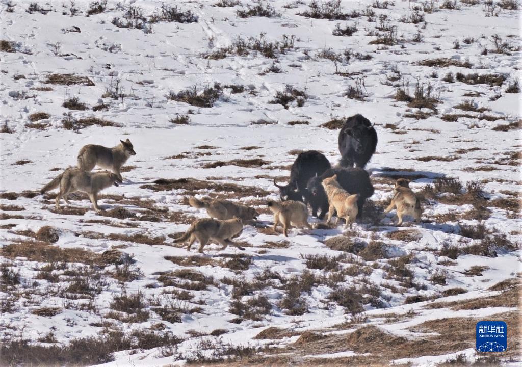 這是在四川省阿壩藏族羌族自治州若爾蓋縣境內拍攝的草原狼圍攻牦牛(2019年12月18日攝)。新華社 王冀川 攝