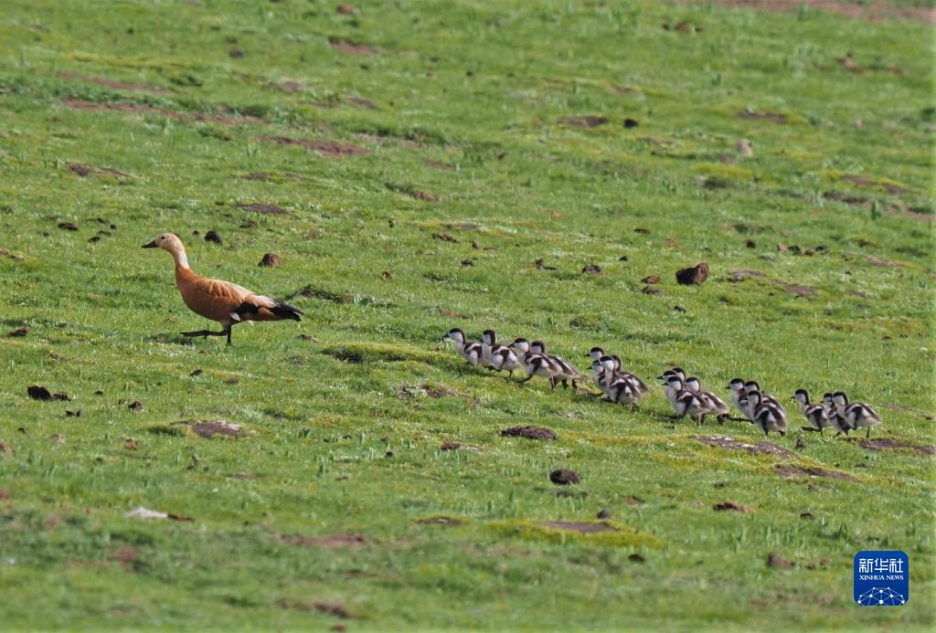 這是在四川省阿壩藏族羌族自治州若爾蓋縣境內拍攝的帶著多只幼崽的赤麻鴨(2021年6月6日攝)。新華社 王冀川 攝