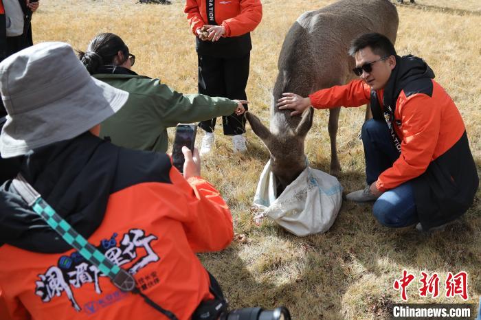 圖為西藏類烏齊馬鹿國家級(jí)自然保護(hù)區(qū)的管護(hù)員正在飼喂馬鹿?!∪轿木?攝