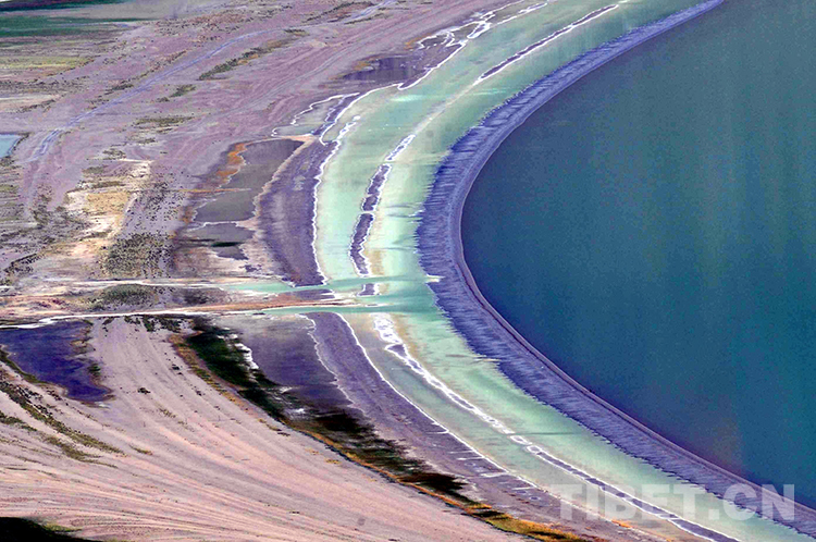 圖為班戈縣被賦予美麗傳說的硼砂湖。它的周圍有9道寬寬的環湖圈,有綠色的,有棕色的,五彩斑斕,清晰可見(唐召明2001年攝)