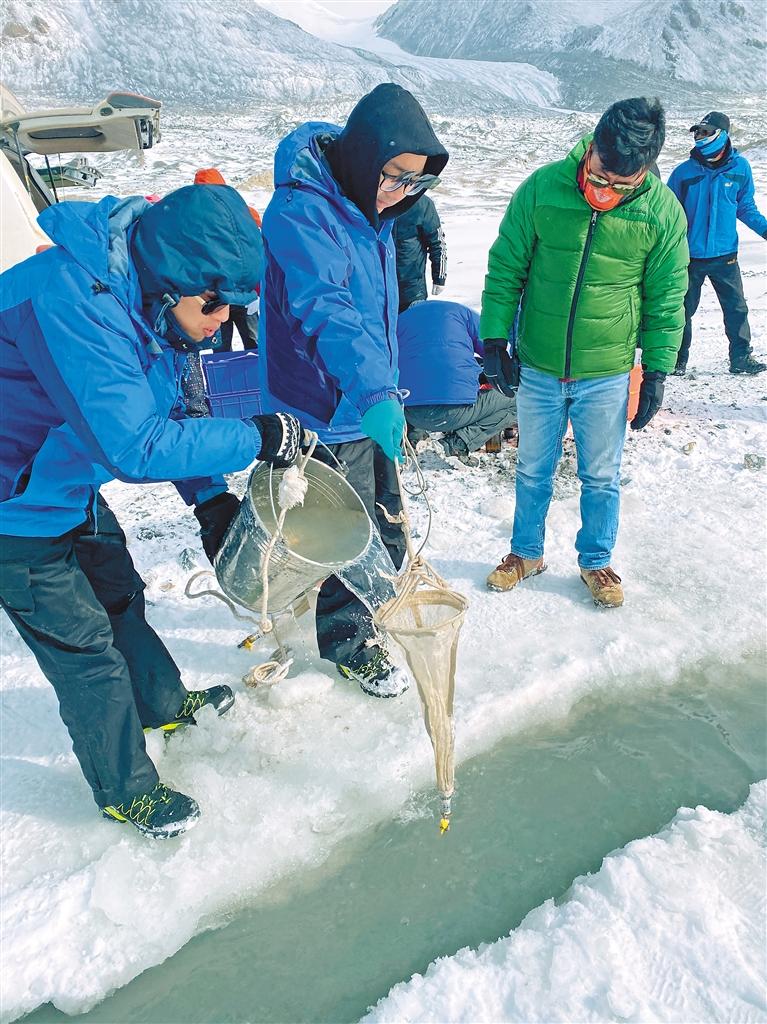 在姜根迪如冰川前的河道采取水生物樣本時,于愛琛要鑿開近10厘米的冰面,冰渣子進入收集網里,又要用手取出來。即使戴著手套,刺骨的水溫也能通過手指使寒意襲遍全身,他整個手臂如同電量快耗盡的機器,緩慢機械地進行著工作。但由于氣溫太低,沾了水的收集網很快又會被凍住,為了抓緊時間將樣本裝入瓶中,于愛琛索性取下手套,用開水將結冰的收集網融化,這一冷一熱間,整雙手早已麻木。當時,于愛琛整個臉都是發腫鐵青的,紫黑色的嘴唇完全爆皮,說話時血從嘴唇皸裂處流出也不自知。