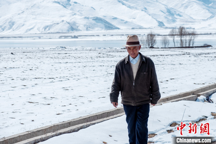 2月23日,在旦增所在的拉薩市林周縣卡東村附近的虎頭山水庫,中新社記者看到,上百只黑頸鶴在雪地里休閑覓食,田間也傳來聲聲鶴鳴。
