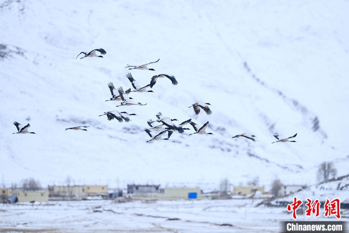 圖為2月23日,西藏林周縣虎頭山水庫附近村莊上空,一群黑頸鶴飛過,遠處白雪皚皚。 中新社記者 江飛波 攝