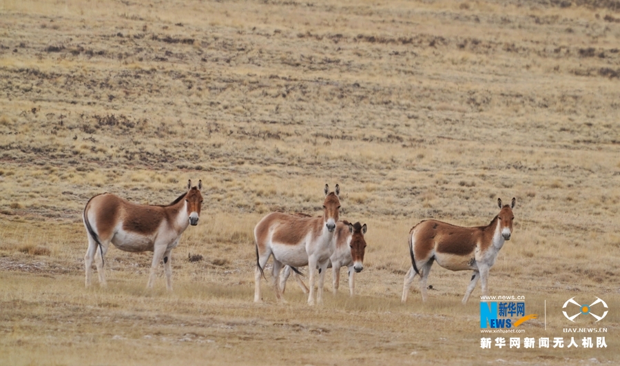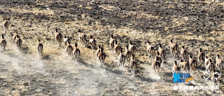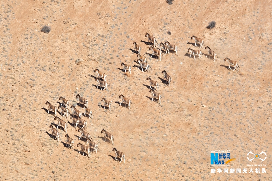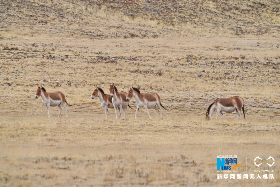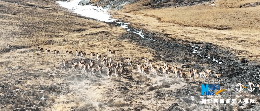 這是近日在甘肅省張掖市肅南裕固族自治縣祁豐藏族鄉禁牧區拍攝到的大種群藏野驢。新華網發 武雪峰 攝 飛手 安維斌